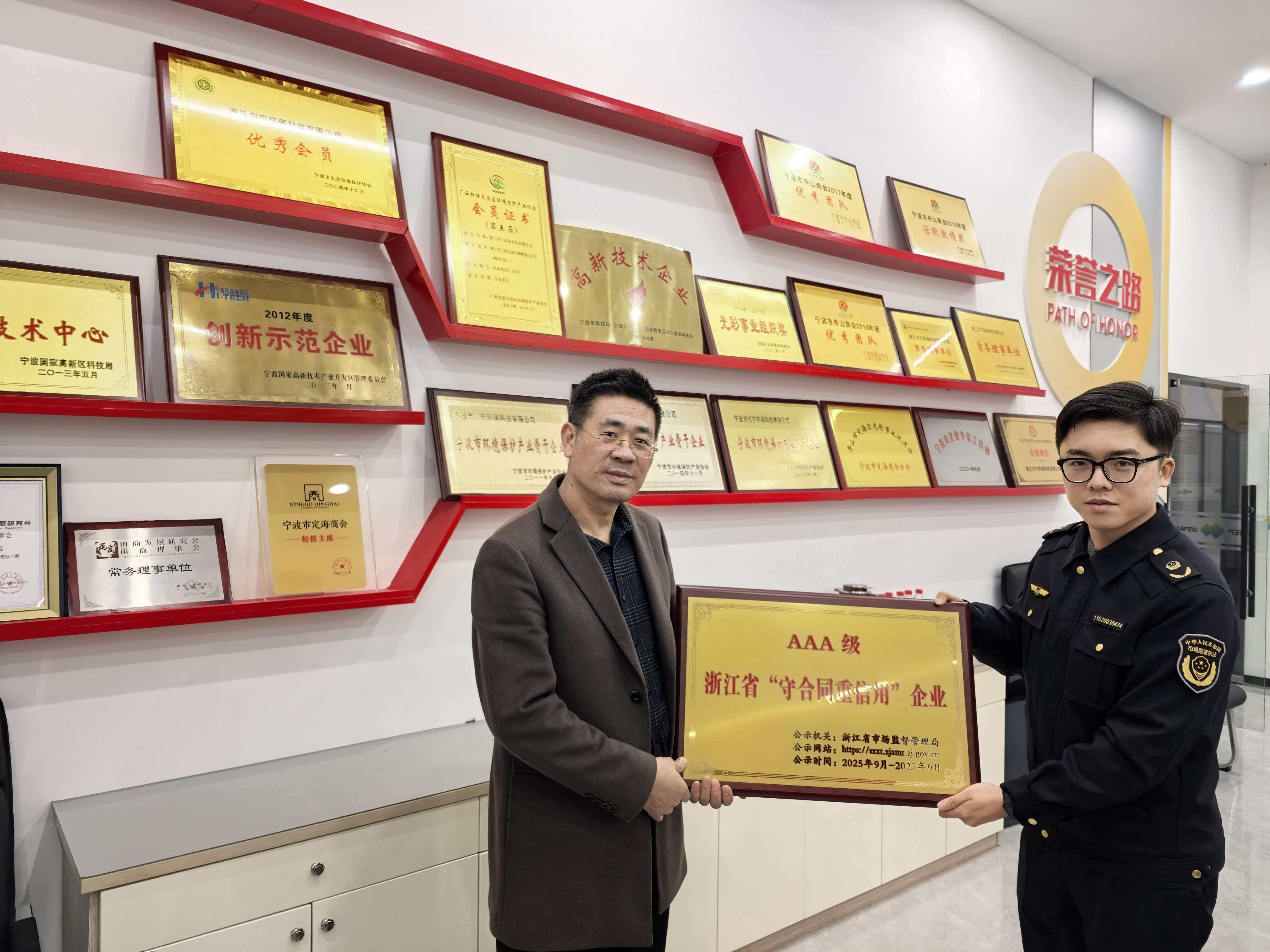 12月24日,寧波市高新區(qū)市場監(jiān)督管理局領(lǐng)導(dǎo)蒞臨浙江川寧環(huán)??萍加邢薰荆蛭宜绢C發(fā)—浙江省AAA級“守合同重信用”榮譽牌匾。